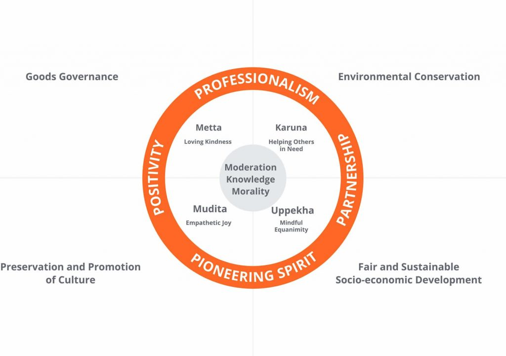 For people in a society to be truly happy, satisfying their needs has to come with equitable socio-economic development within the limits of what nature can provide, integrated with good governance and all while allowing people to maintain their cultural identity and practices. In the Gross National Happiness Philosophy of Bhutan these factors are called the four pillars of balanced development. If they are not carefully considered, other people will suffer and then true abiding happiness cannot exist. B.Grimm has always been following these same four pillars with its many social programs alongside our business activities to develop and promote religion, education, environment, sports, music and arts.