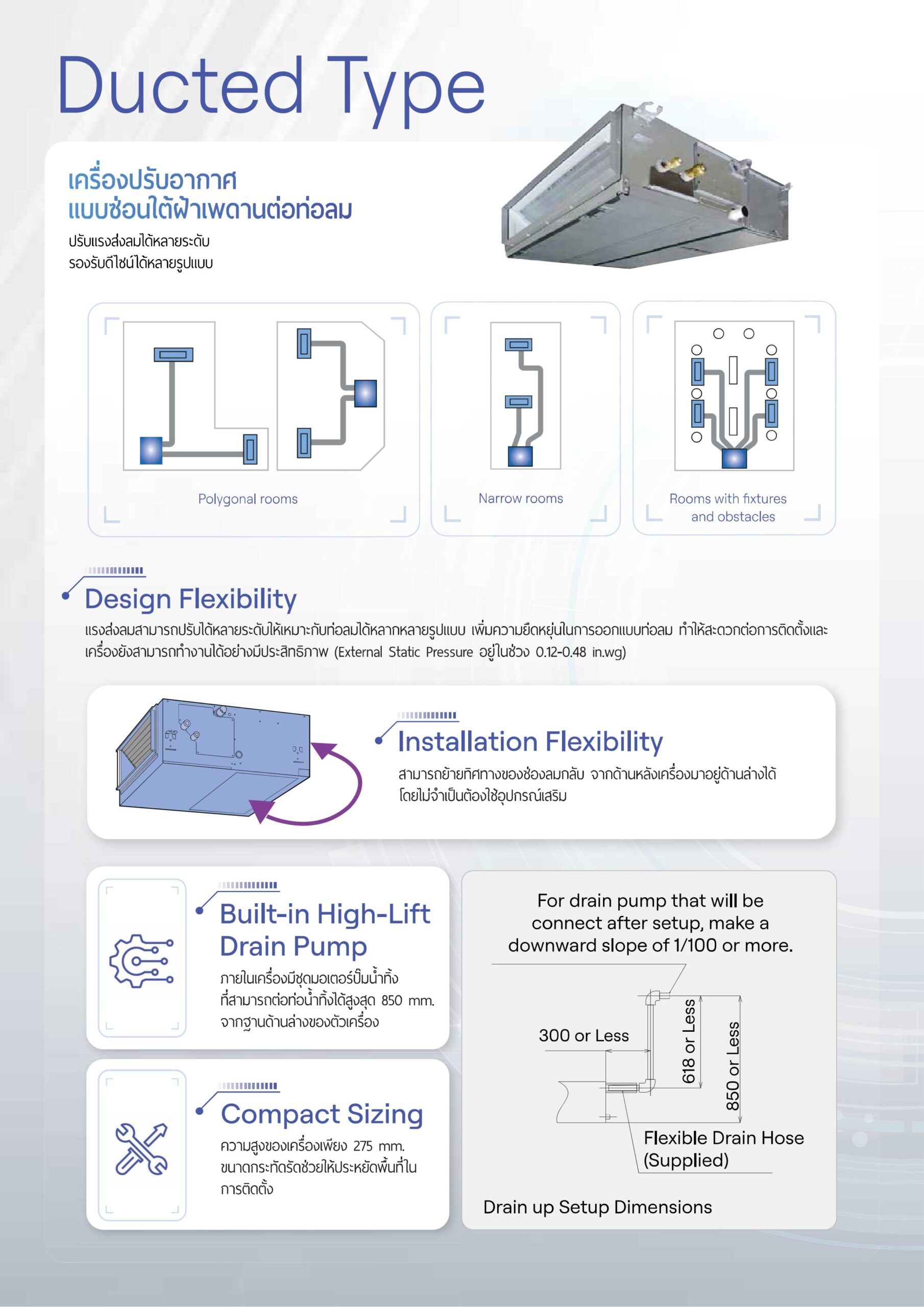 คุณสมบัติด้านความน่าเชื่อถือ เป็นมิตรต่อสิ่งแวดล้อมและประหยัดพลังงาน ลด GWP โดยใช้สารทำความเย็น R32 (ปริมาณสารทำความเย็นลดลง) ผ่านเกณฑ์การประหยัดพลังงานและมาตรฐานของเครื่องปรับอากาศ EGAT #5 +3star, TIS 2134-2553 และ TIS 1529-2561 แรงดันสถิตภายนอกสามารถเพิ่มได้สูงถึง 120 pa (สูงสุด) เพื่อให้สามารถเข้าถึงทุกพื้นที่ของห้องเพื่อให้อุณหภูมิกระจายตัวเท่ากัน ไม่ว่าเค้าโครงจะซับซ้อนเพียงใด กล่องอินเวอร์เตอร์ที่ซีลแนบแน่นเพื่อป้องกันการเกิดข้อผิดพลาดจากทราย ฝุ่นและสัตว์ขนาดเล็ก ผลิตภัณฑ์เป็นการผสมผสานของ Twin Rotary Compressor และการควบคุมด้วยอินเวอร์เตอร์ ด้วยสารทำความเย็น R32 ช่วยให้ได้รับการรับรองในความแม่นยำและความเชี่ยวชาญของคุณภาพที่ไม่มีตำหนิ ปริมาณอากาศเพิ่มขึ้นและระดับเสียงลดลงเมื่อเทียบกับรุ่นก่อนหน้า เทคโนโลยีล่าสุด ความเชื่อถือได้สูงและการเพิ่มประสิทธิภาพในด้านความปลอดภัย การทำความสะอาดตัวเครื่องปรับอากาศด้วยตัวเครื่องเองด้วย Magic coil ทำหน้าที่ในการลดการสะสมของฝุ่นและสารต่างๆ ที่เกิดจากการใช้งาน เพื่อให้เครื่องปรับอากาศทำงานได้อย่างต่อเนื่องและประหยัดพลังงาน การติดตั้งปั๊มน้ำอยู่แล้วในตัวเครื่องปรับอากาศ และมีความสามารถในการส่งน้ำทิ้งสูงขึ้นได้ถึง 660mm. ขนาดของตัวเครื่องปรับอากาศที่บางเพื่อให้สามารถติดตั้งได้ในพื้นที่จำกัด และเสนอโอกาสการติดตั้งที่หลากหลายให้กับลูกค้า มอเตอร์พัดลม DC ที่มีประสิทธิภาพสูง เพื่อเพิ่มประสิทธิภาพของมอเตอร์พัดลมและชุดแผงคอยล์แลกเปลี่ยนความร้อน การไหลของอากาศในตัวเครื่องปรับอากาศแบบ 4‑Way cassette ที่มีการควบคุมได้ 5 ระดับ ช่องรับอากาศบริสุทธิ์จากภายนอกสำหรับการจ่ายอากาศคุณภาพสูง สร้างความสะดวกสบายและสภาพแวดล้อมที่ดีต่อสุขภาพ ฟังก์ชันการทำความสะอาดตัวเครื่องปรับอากาศด้วยตัวเอง โดยมีลมไหลเวียนผ่านคอยล์ที่ระดับต่ำ เพื่อทำให้คอยล์แห้ง ไม่มีกลิ่นอับชื้น และลดความถี่ในการบำรุงรักษา ช่วงอุณหภูมิการทำงานของเครื่องภายนอกบ้าน 21-46 องศาเซลเซียส Ionizer (อุปกรณ์เสริม) ควบคุมการทำงานผ่าน Smart phone/Tablet ด้วย Application “Carrier Smart WIFI” (อุปกรณ์เสริม) รับประกันคอมเพรสเซอร์ 7 ปี รับประกันอะไหล่ 2 ปี คุณสมบัติการติดตั้ง เครื่องปรับอากาศขนาดกะทัดรัด เครื่องปรับอากาศที่มีขนาดเล็กกว่าและเบากว่าเครื่องปรับอากาศรุ่นเดิม มีการออกแบบให้ติดตั้งได้ง่ายและเหมาะสำหรับผู้ติดตั้ง .